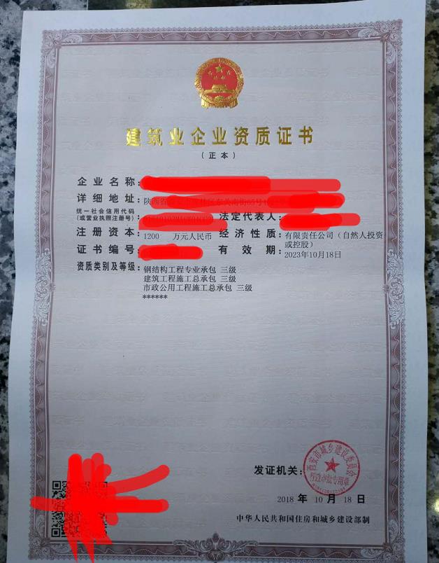 該資質包含建筑工程施工總承包、市政公用工程施工總承包、環保工程專業承包資質三級,安全2019年3月下證,歡迎咨詢